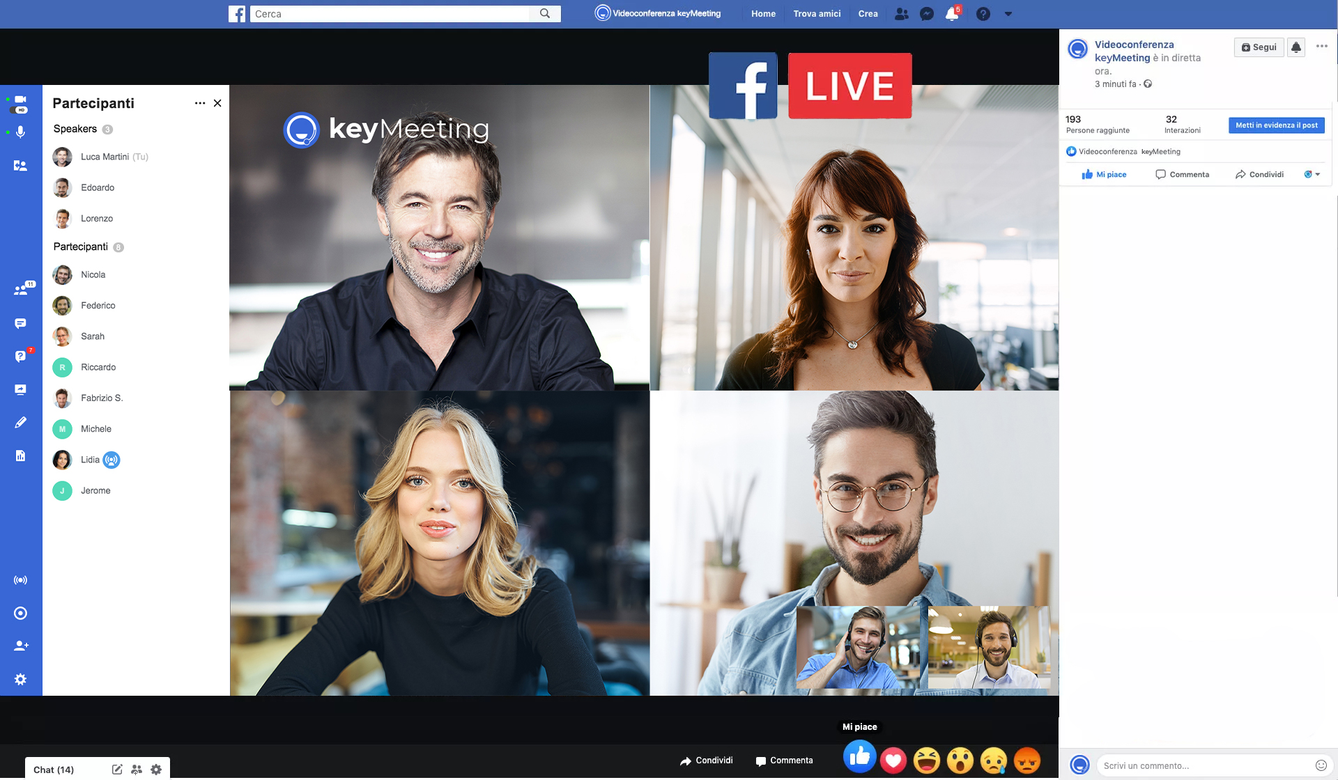 Sfrutta tutta la potenza di Facebook e YouTube per raggiungere follower in tutto il mondo, aumenta in modo esponenziale la visibilità del tuo brand aziendale e migliora la tua collaborazione online con le potenti funzionalità di KeyMeeting Live.
