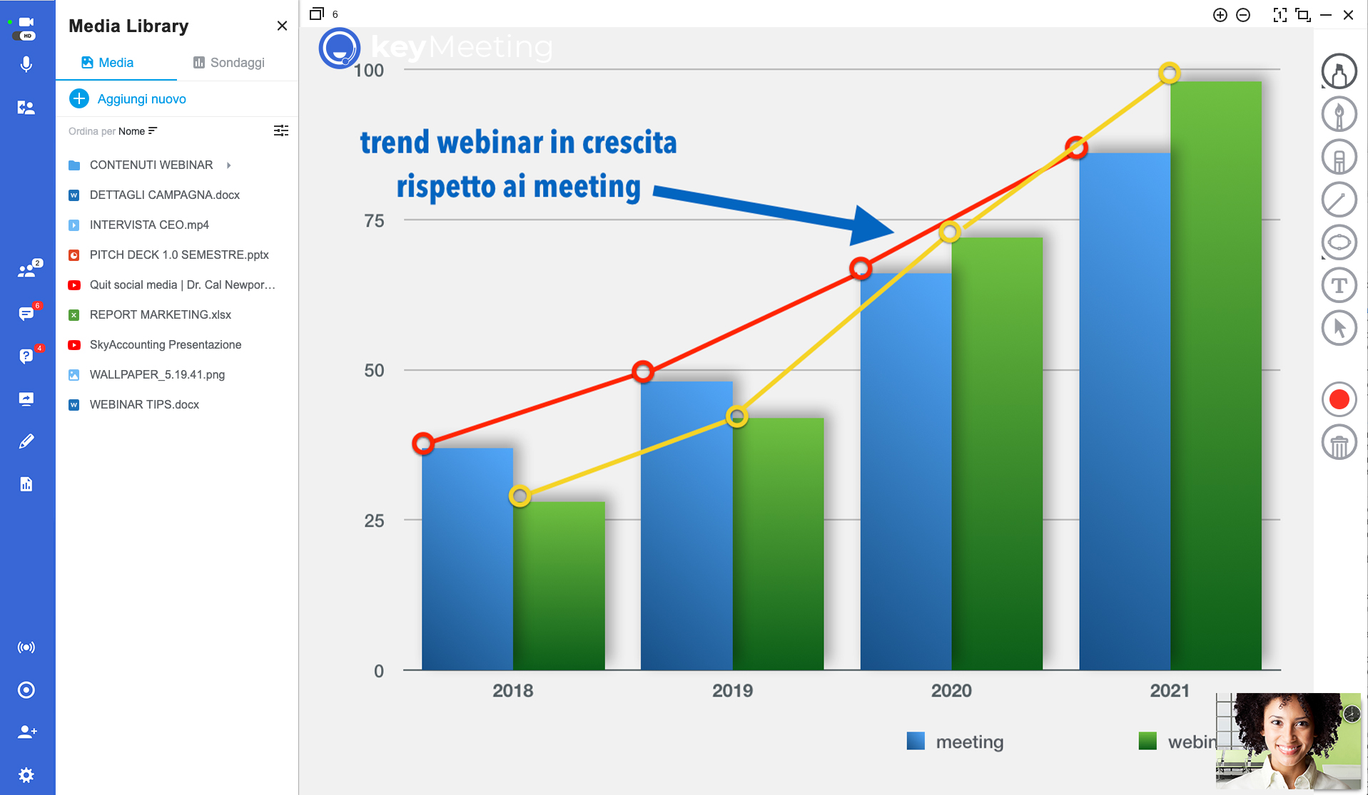 KeyMeeting Live ti offre una serie di strumenti grafici per annotare, evidenziare e commentare documenti e presentazioni durante i tuoi meeting. Grazie alle funzioni di zoom, potrai ingrandire particolari di un’immagine anche ad alta definizione, trasformando le tue presentazioni in esperienze interattive senza confronti.